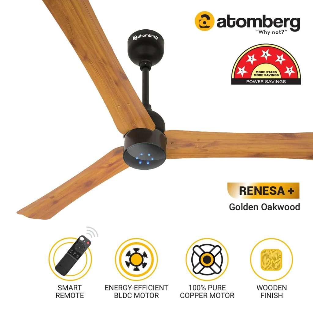 Atomberg Renesa+ 56″ 35 Watt BLDC motor Energy Saving Anti-Dust Speed Indicator Light Ceiling Fan with Remote Control (Golden OakWood)