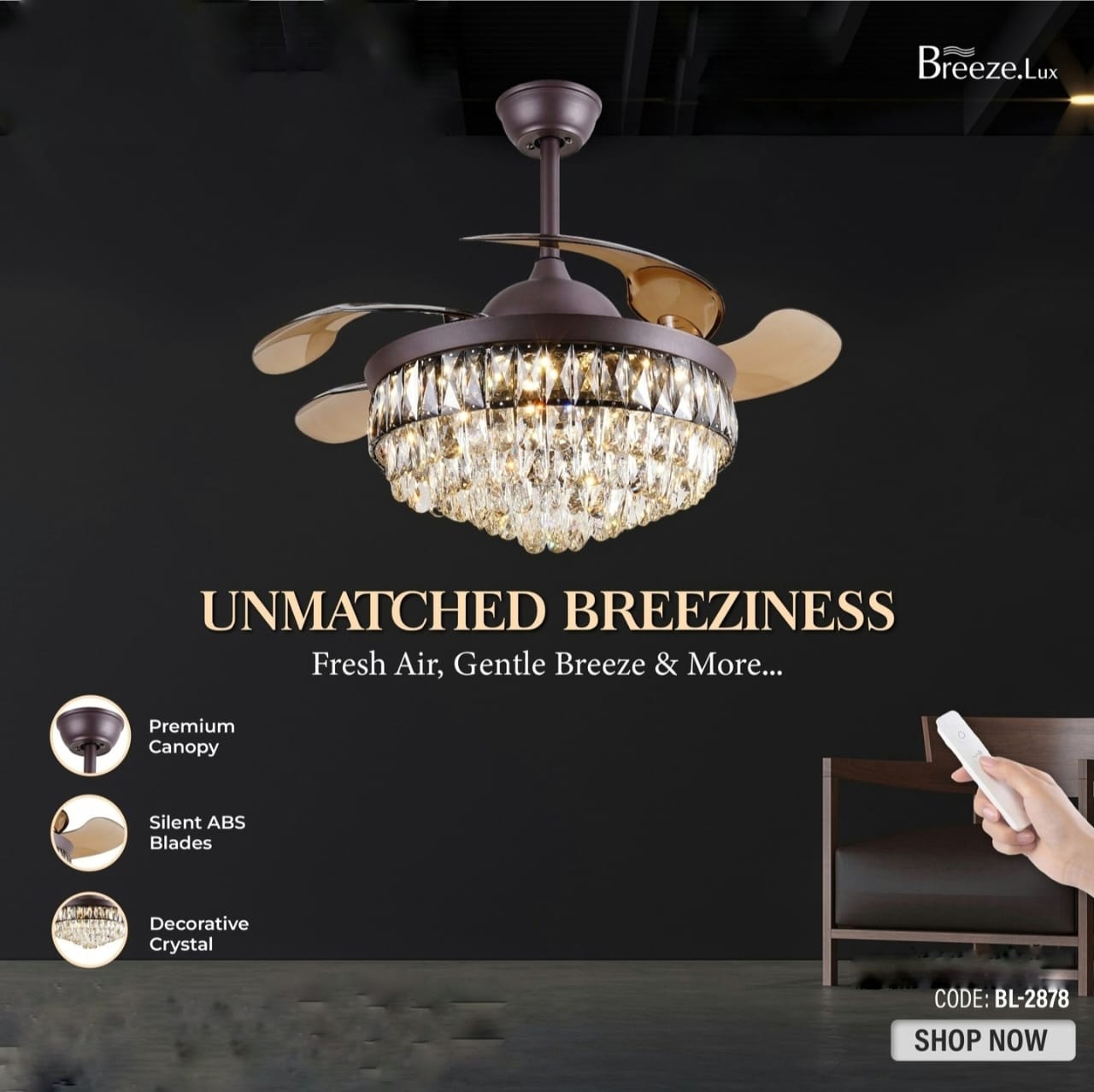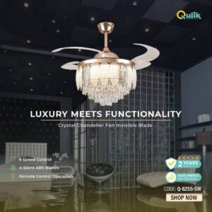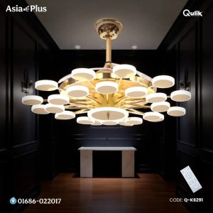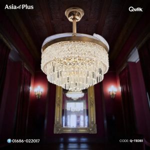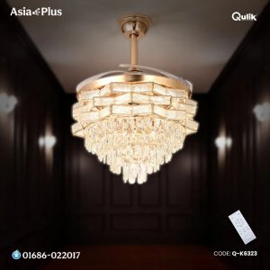 Breezelux Alpha 48″ Crystal Retractable Luxury Decorative Silent Underlight Invisible Blade Chandelier With Remote Ceiling Fan (Golden) BL-2863