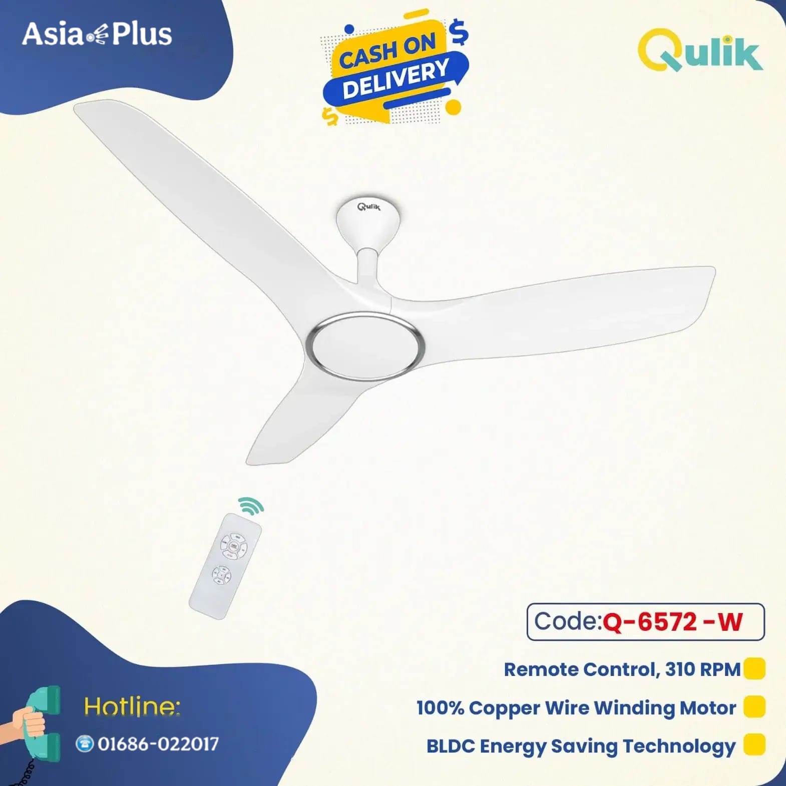 Qulik Aerovane 52″ Modern Decorative Silent ABS Blade Remote Ceiling Fan (White) Q-6572-W