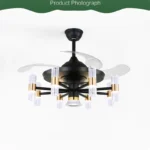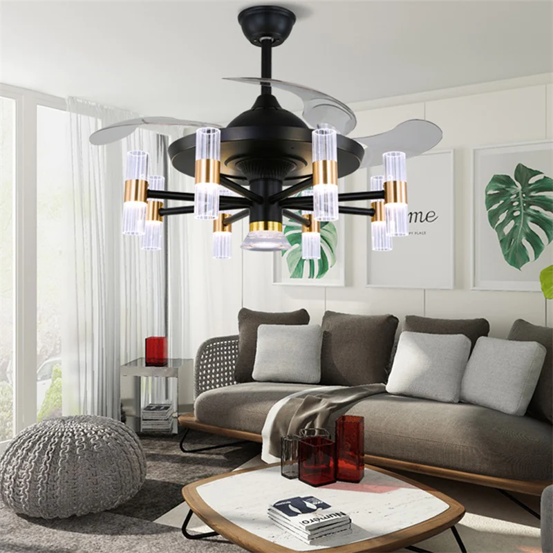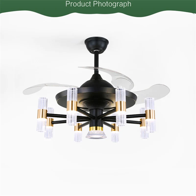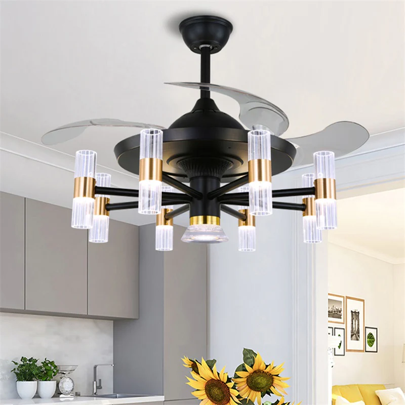 Qulik 48 Inch Modern Chandelier Retractable Invisible Blade Silent 3 Color Change LED Remote Ceiling Fan (Black) Q-6061-D