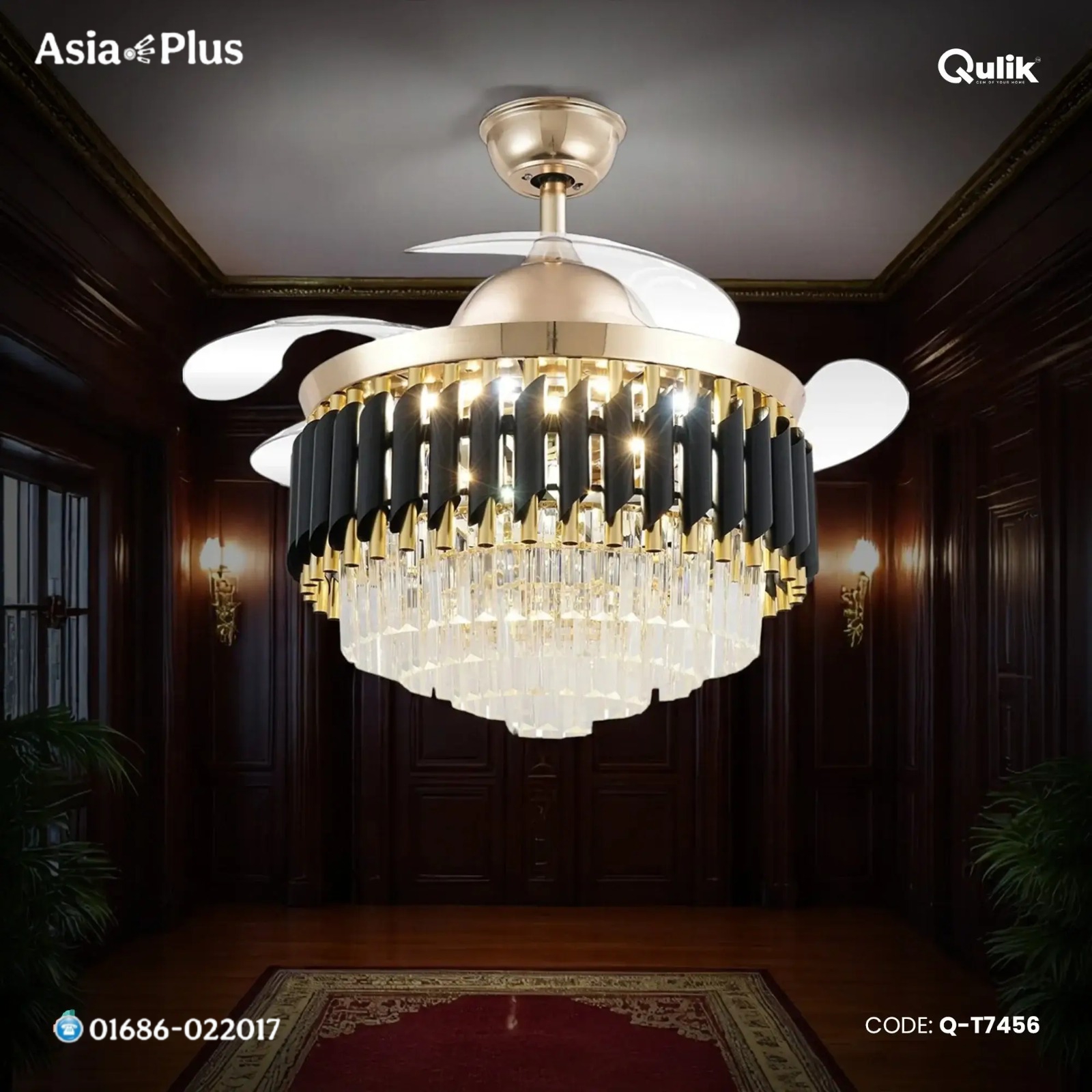 Qulik Crystal Chandelier Retractable Ceiling Fan(Golden) | Q-T7456