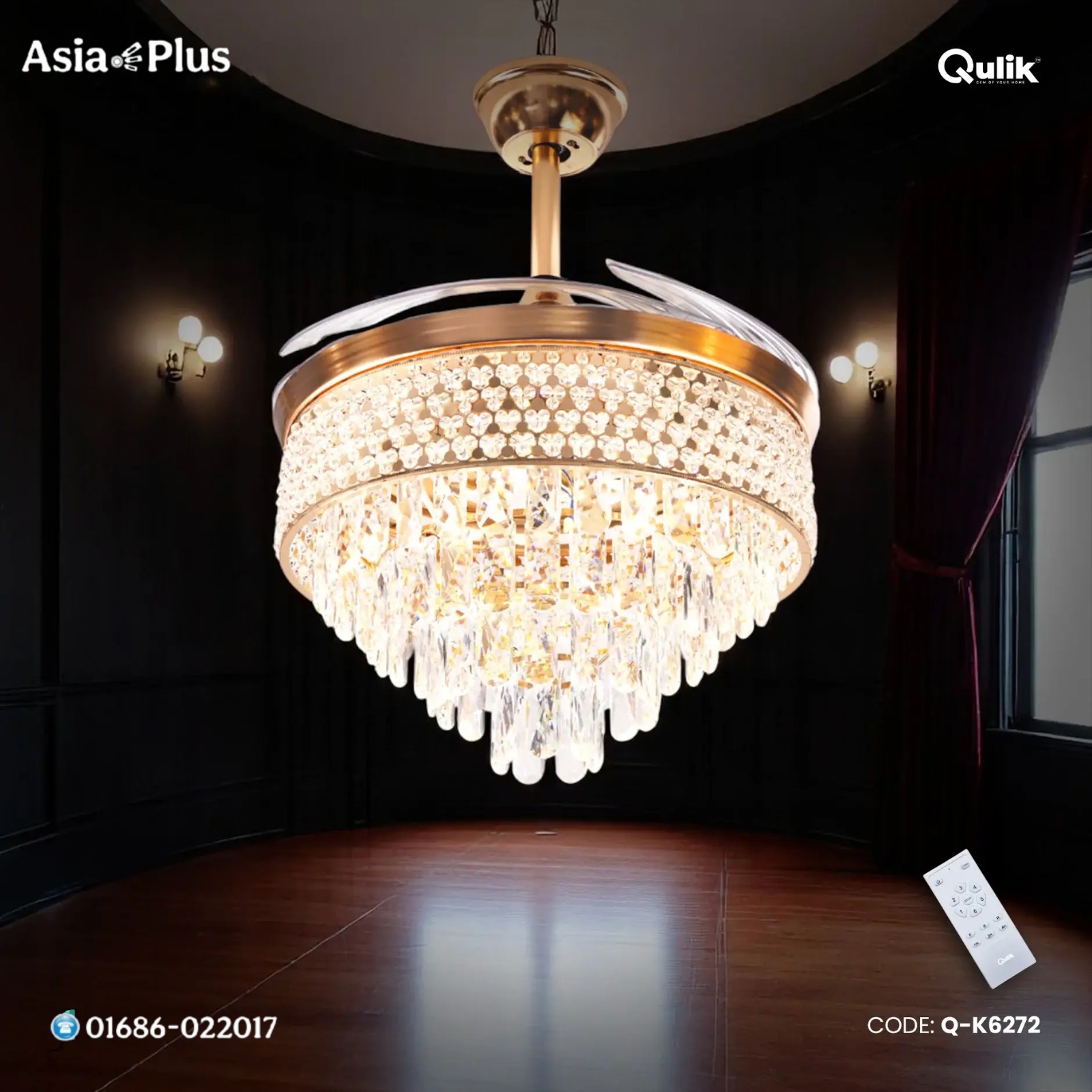 Buy Qulik 48″ Crystal Chandelier Retractable Invisible Blade Silent 3 Color Change LED Remote Ceiling Fan (Golden) | Q-K6272 the best Fan Shop in BD