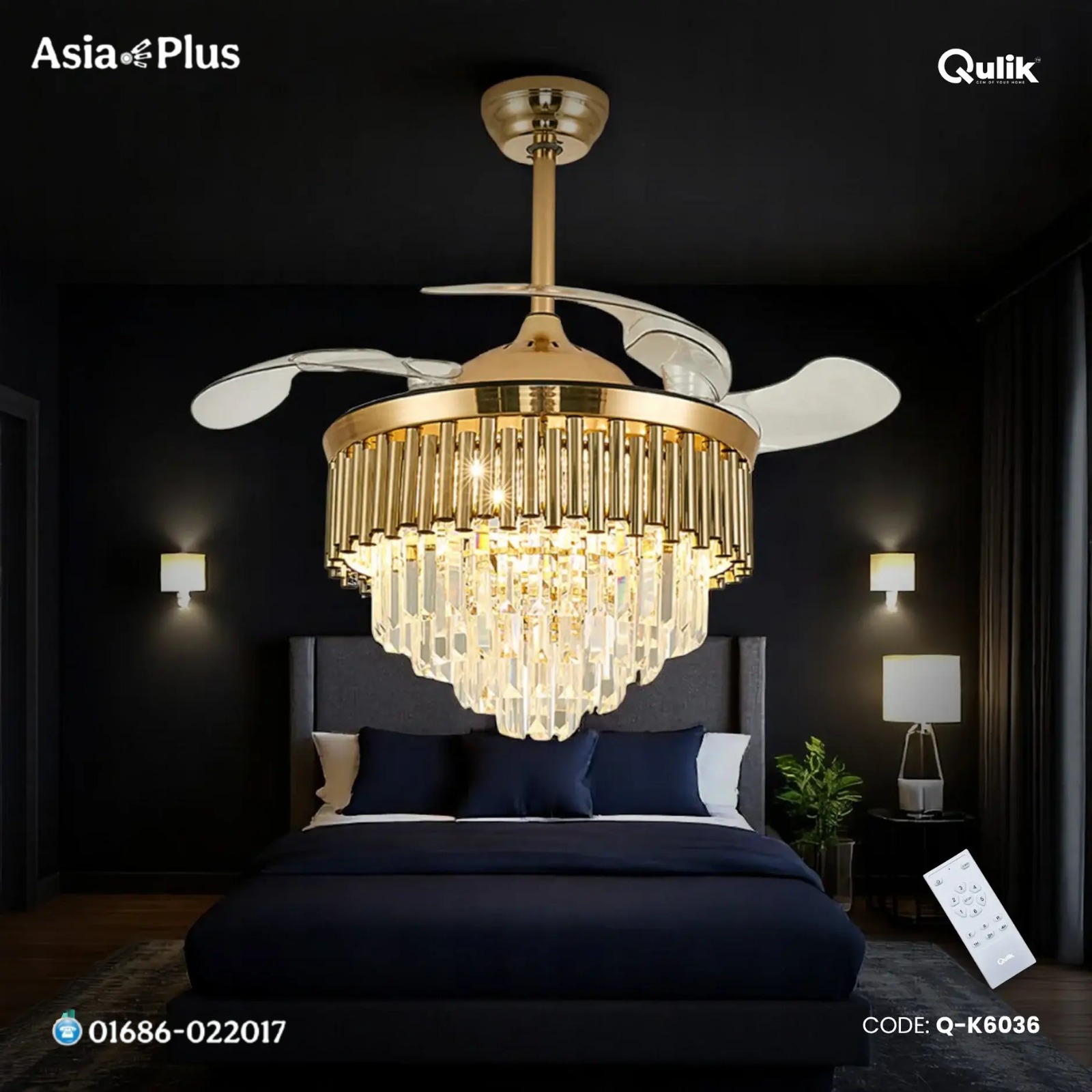 Buy Qulik 48″ Crystal Chandelier Retractable Invisible Blade Silent 3 Color Change LED Remote Ceiling Fan (Golden) | Q-K6036 the best Fan Shop in BD