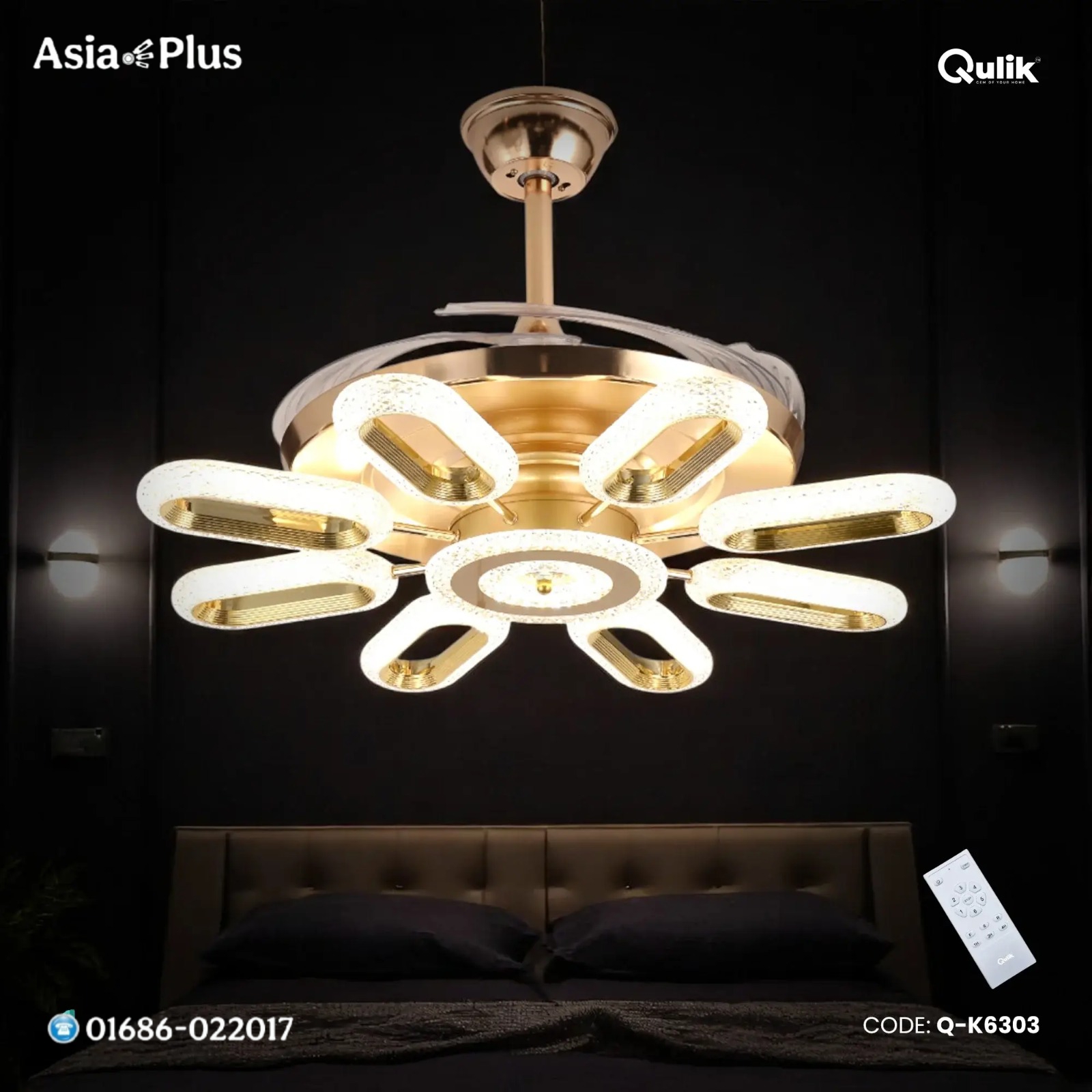 Buy Qulik 48″ Modern Chandelier Retractable Invisible Blade Silent 3 Color Change LED Remote Ceiling Fan (Golden) | Q-K6303 the best Fan Shop in BD