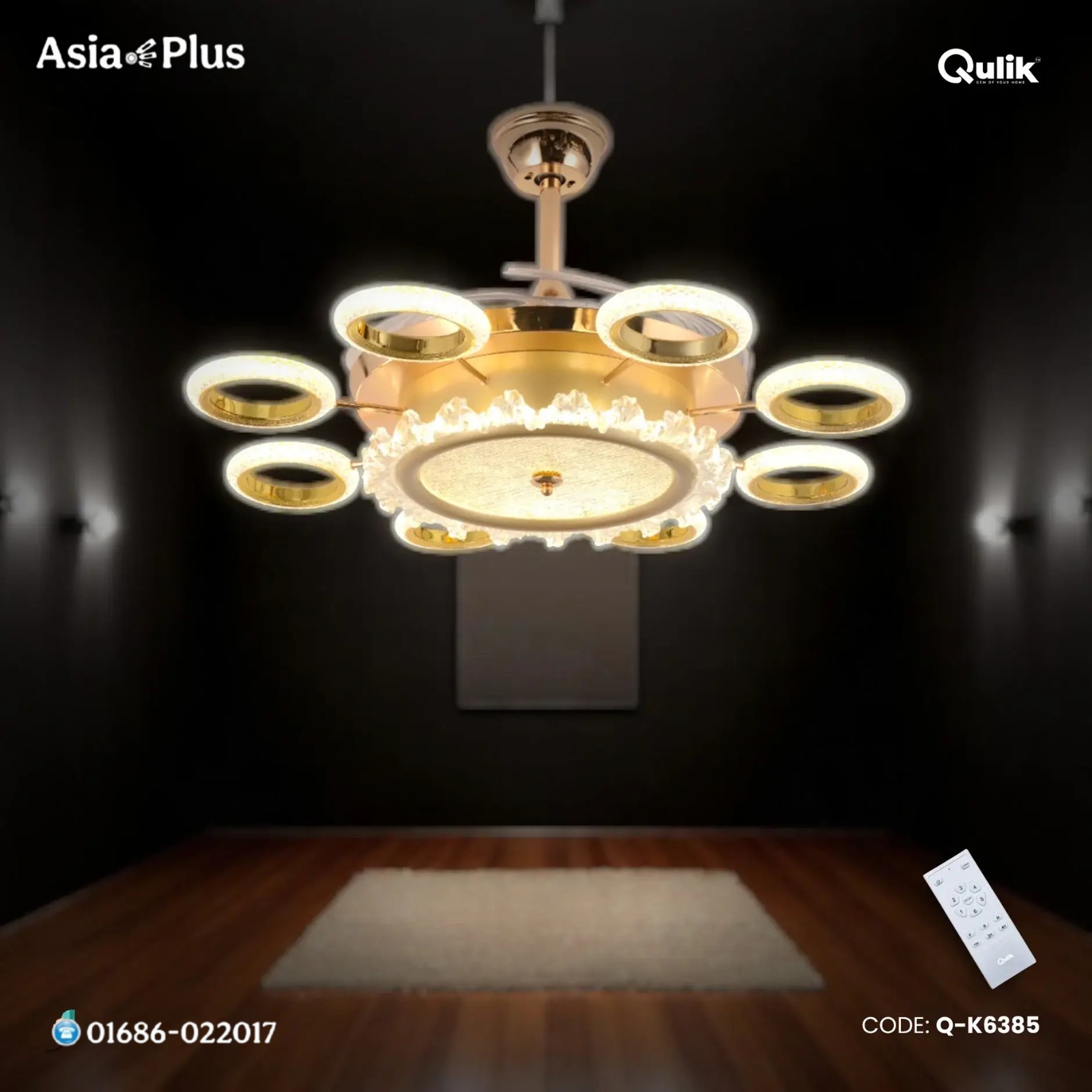 Qulik 48″ Modern Chandelier Retractable Invisible Blade Silent 3 Color Change LED Remote Ceiling Fan (Golden) | Q-K6385