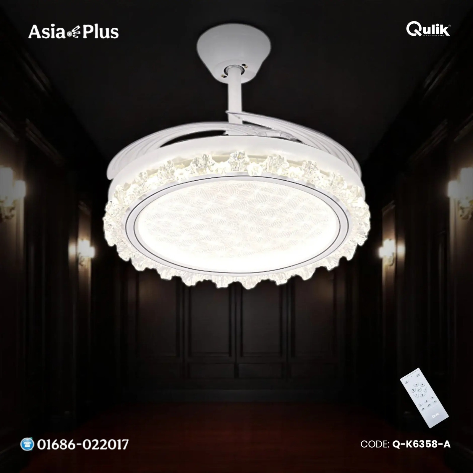 Qulik 48″ Crystal Chandelier Retractable Invisible Blade Silent 3 Color Change LED Remote Ceiling Fan (White) | Q-K6358-A