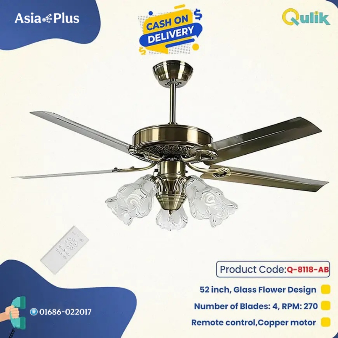 Elevate your interior decor with the Qulik Q-8118-AB European Style Ceiling Fan – an embodiment of style, functionality, and comfort. From its European-inspired design and premium materials to its versatile lighting options and adjustable features, this fan redefines your living spaces, making them more inviting and elegant than ever before.